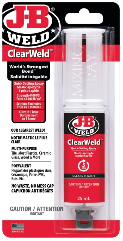 ClearWeld™ is a quick setting, multipurpose two part epoxy that provides a strong and lasting bond on most surfaces including tile, most plastics, ceramic, glass, wood and metal. ClearWeld™ is designed to cure with a clear, transparent bond when used at thicknesses of less than 15 mil. ClearWeld has a 1:1 mixing ratio, sets in 5 mins and cures in 1 hr. With a tensile strength of 4400 psi, ClearWeld™ sets to a hard, permanent bond.