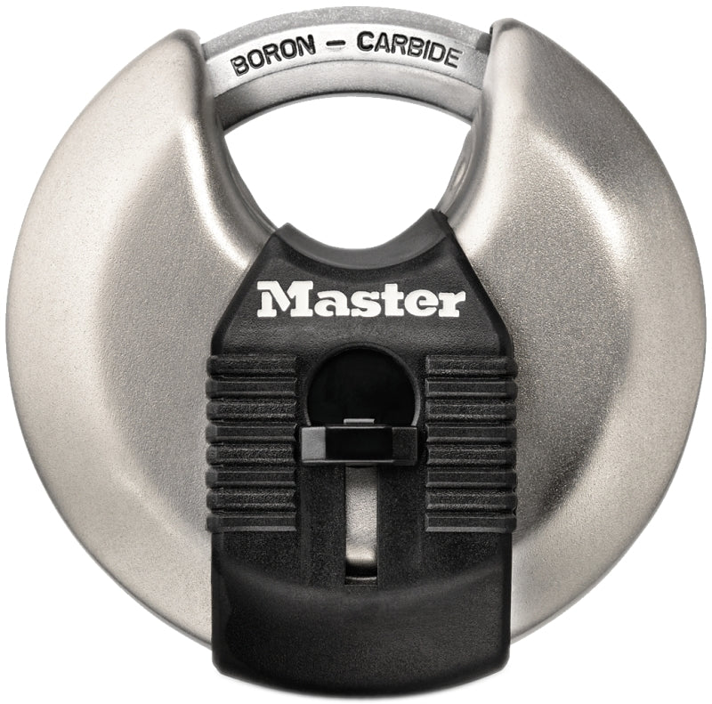The Master Lock Magnum® M40XD discus padlock features a 2-3/4 in (70 mm) wide stainless steel body for maximum strength, reliability and corrosion resistance. The fully shrouded design minimizes shackle exposure and protects against bolt cutter attacks. The 3/8 in (10 mm) Dia octagonal shackle is 5/8 in (16 mm) long and made of Tough-Cut™ boron-carbide, 50% harder than hardened steel, offering maximum resistance to cutting and sawing. The four pin cylinder prevents picking and the dual locking ball bearings provide maximum resistance against prying and hammering. The covered keyway offers maximum weather protection and reinforced body bumper protects against scratches. The lifetime guarantee provides peace of mind from a brand you can trust.