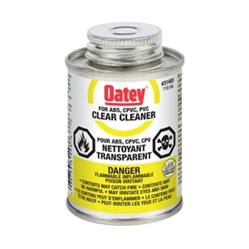 Oatey Primer Cleaner, Net Content: 118 mL, Liquid, Clear/Purple, Odor/Scent: Solvent-Like, Compositions: Acetone, Cyclohexanone, Viscosity: <10 cPs, VOC Content: <25 g/L, Flash Point: -4 deg F, Boiling Point: 133 deg F, Density: 0.79, Application Method: Brush, Roller