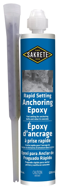 Sakrete rapid setting anchoring epoxy is a two-component epoxy compound used to anchor bolts or other metal objects in concrete and masonry. It is a rapid setting material that can be used in vertical or horizontal applications. This product’s rapid set allows for its use in walls with minimal run-out. Available in 255 ml tubes.